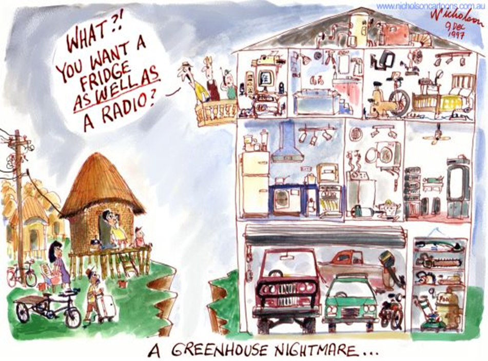 political and community responses, such as carbon trading, energy-policy development, international cooperation, buying local products, and recycling