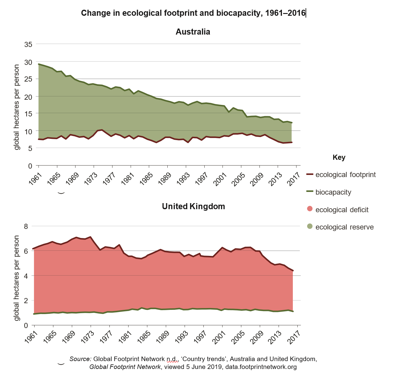 Explain how countries with similar levels of economic development, such as Australia and the UK, can have ecological footprints that vary considerably in size and composition. Refer to Australia and the UK other countries in your answer.