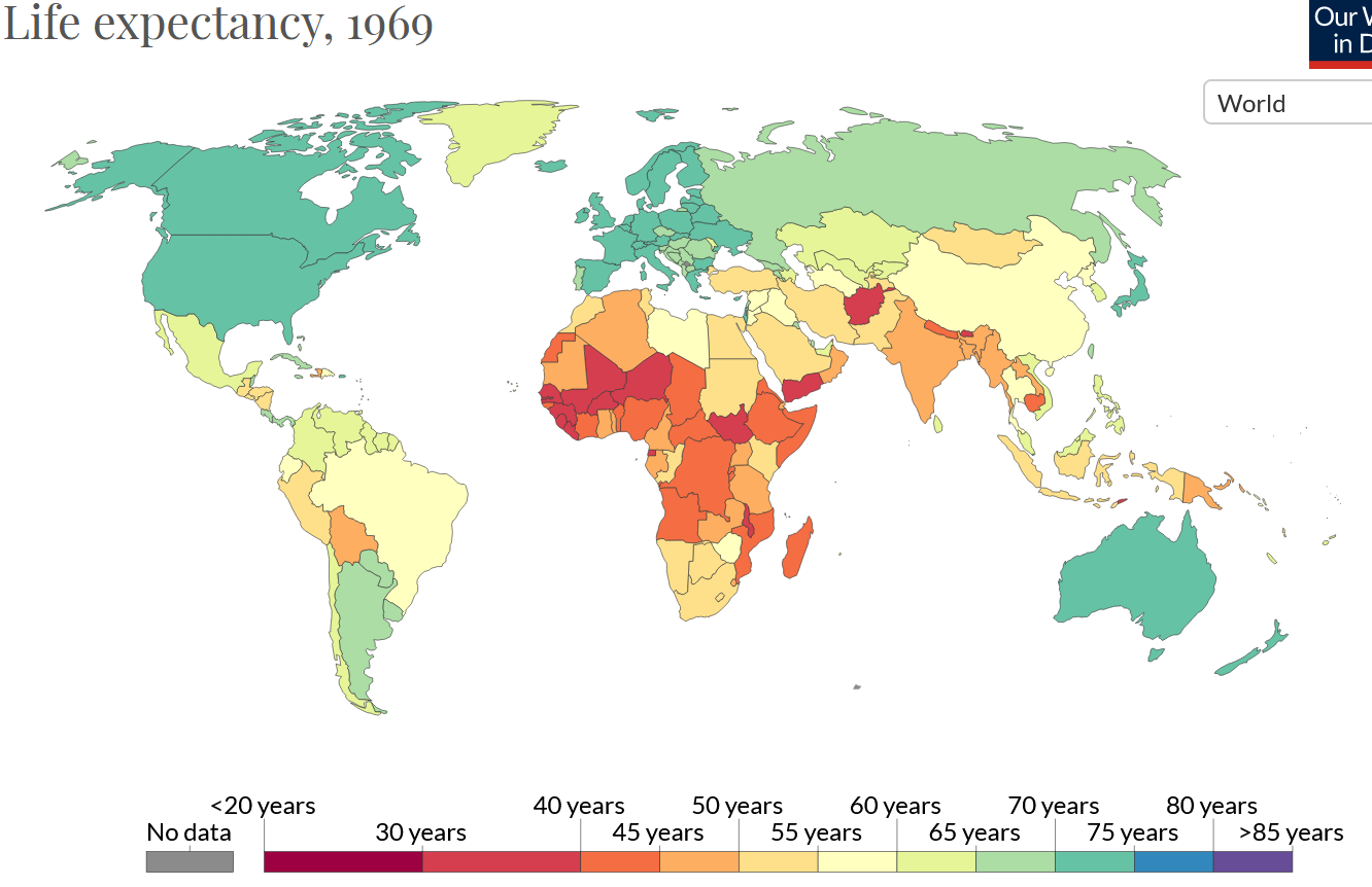 Refer to the following global life expectancy maps for 1969 and 2019 when answering question 1-3.