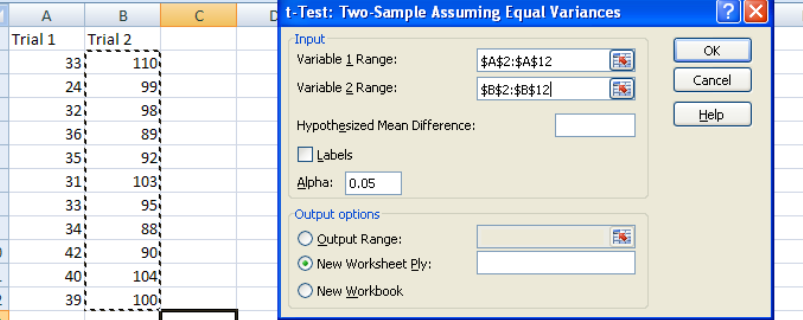 You will now see a window listing statistical tests, scroll down to T Test - Two sample assuming equal variances and click OK