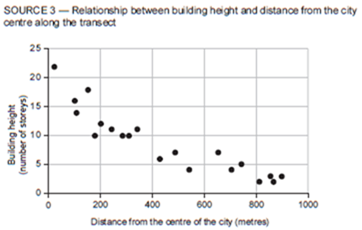 To test Hypothesis 2, the heights of major buildings along the transect were measured in storeys, and their distance from the centre of the city was measured in metres (m)