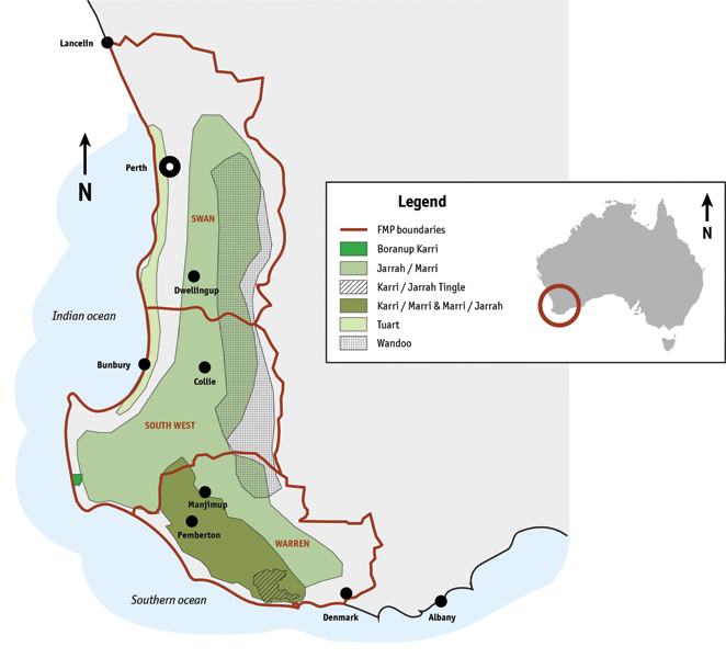 Where are the forests of Western Australia located? (include a labelled map in your answer)