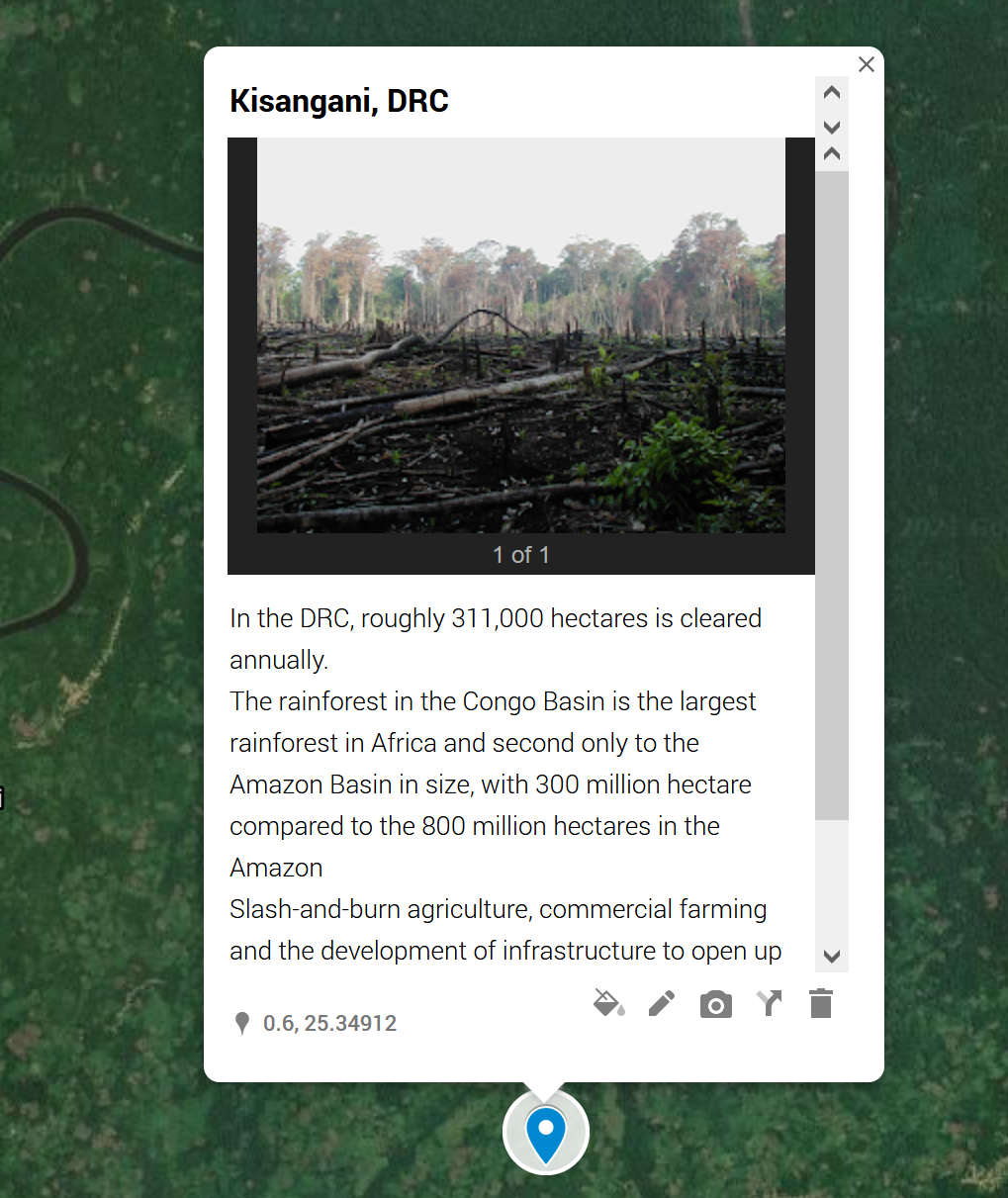 Click on the pin for the country and paste the deforestation data (From above) into the text box using the menu at the bottom of the entry. (pen for the information)