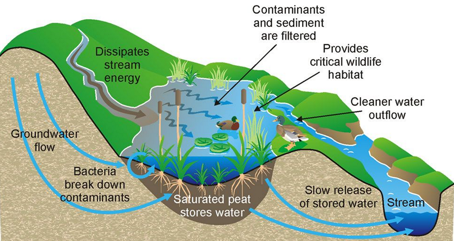 Use your new understanding of wetlands to draw a diagram of the components and processes of a wetland